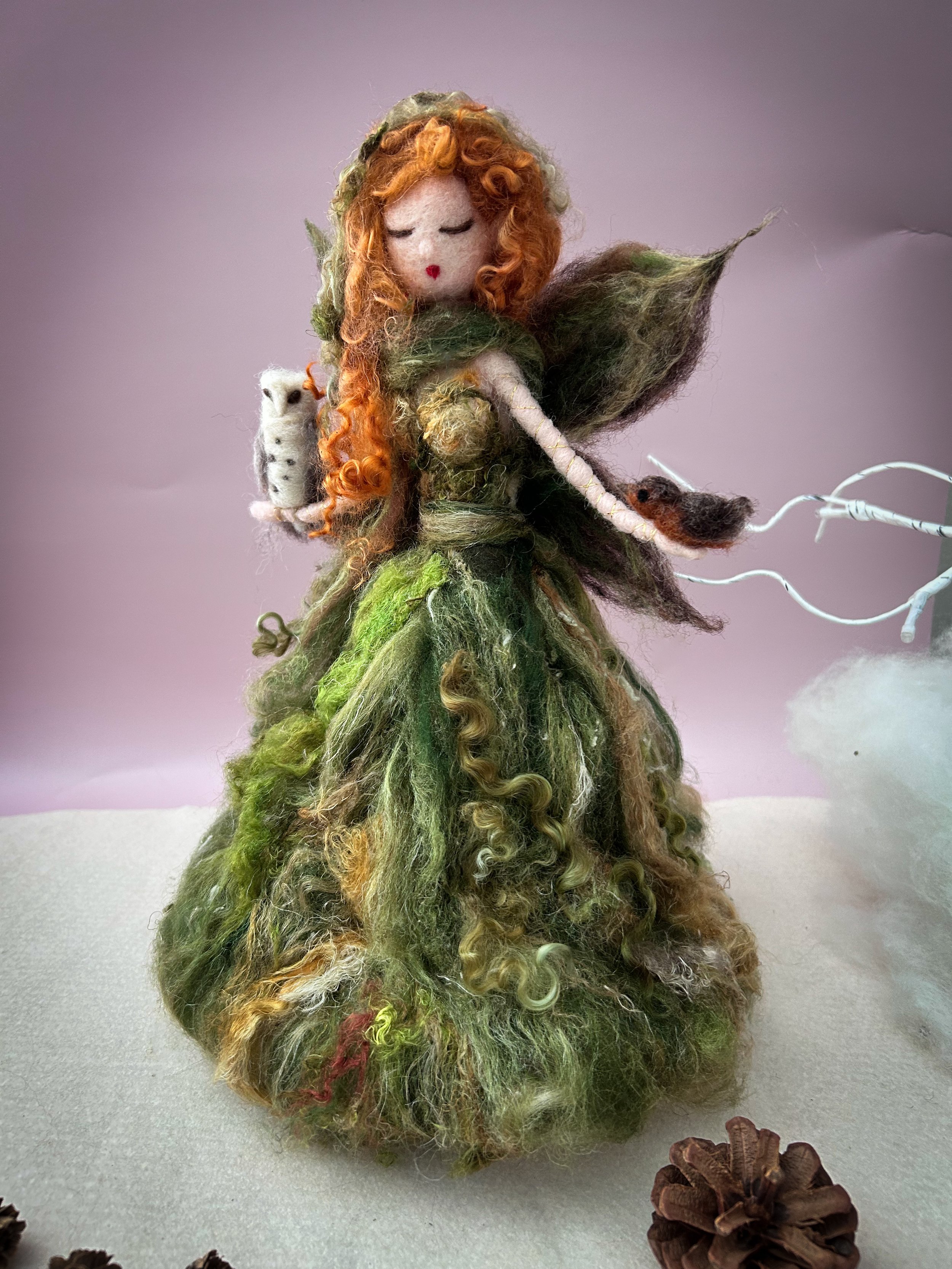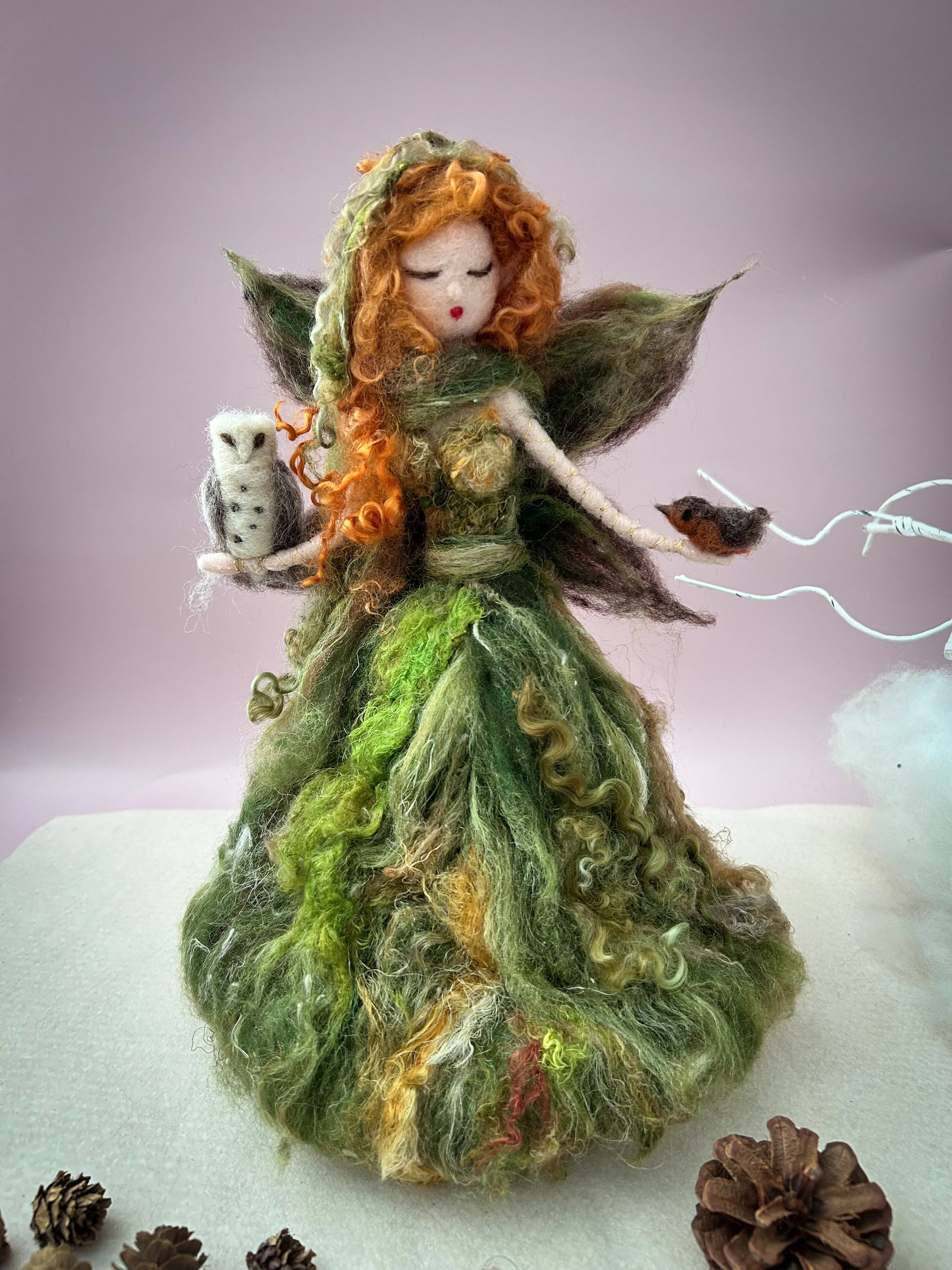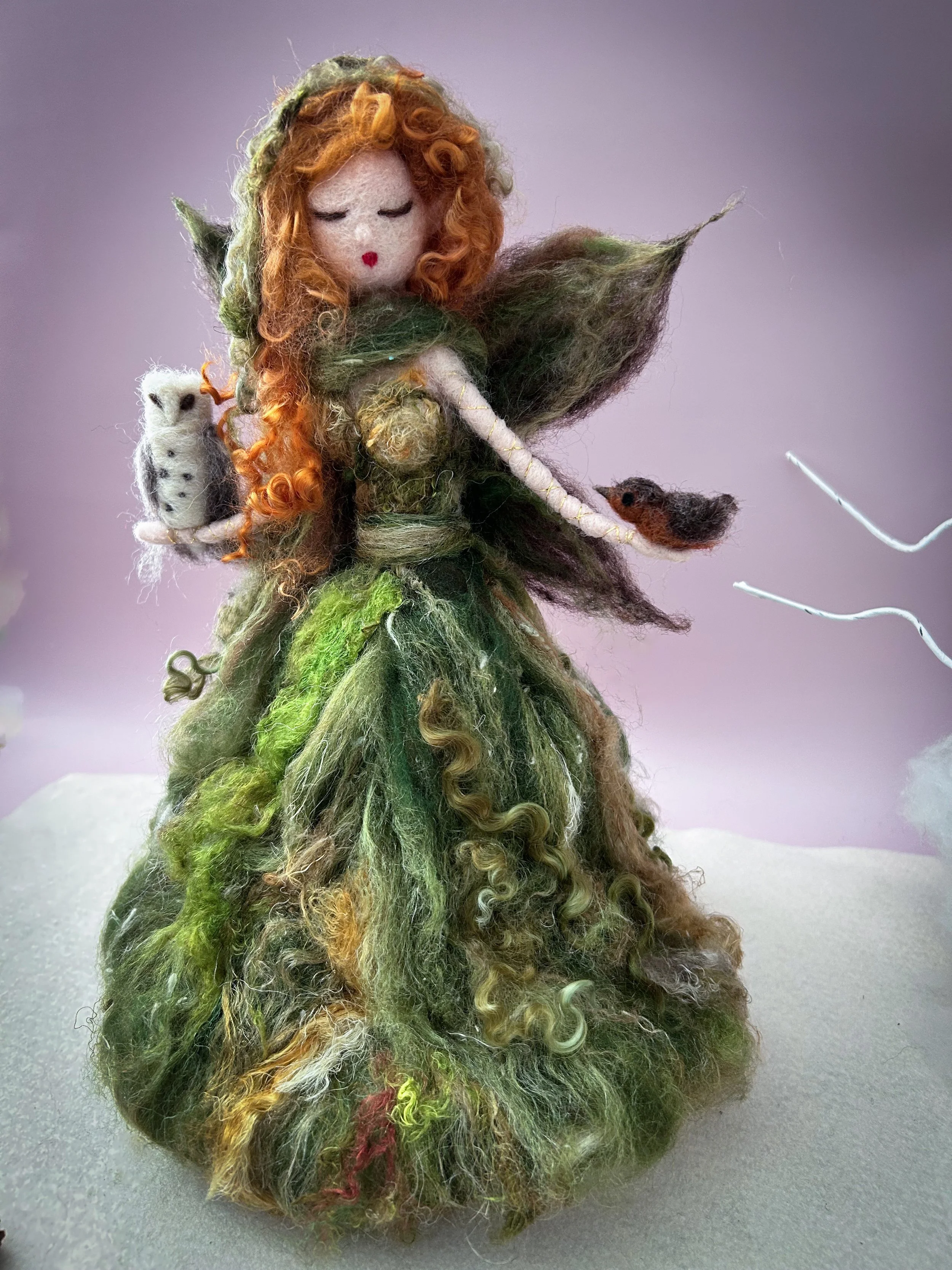 Needle felted from soft merino wool, silk, and natural fibers, this Winter Snow Queen Sorceress embodies the powerful stillness of the Solstice night. Cloaked in black and silver, her gown flows like winter’s midnight sky, with snowy white curls and antlered crown shimmering under soft light. A felted snowy owl rests on her arm, symbol of wisdom and clarity through the dark.