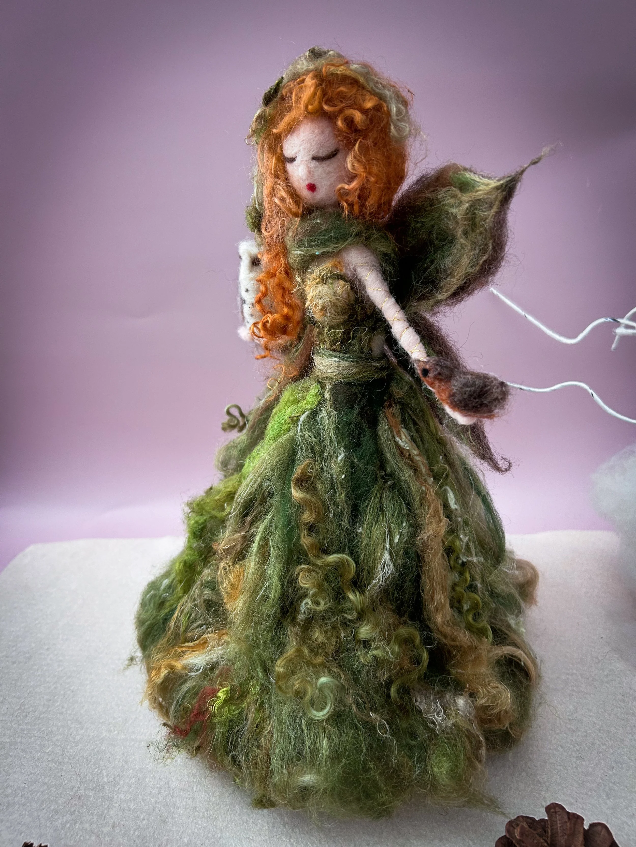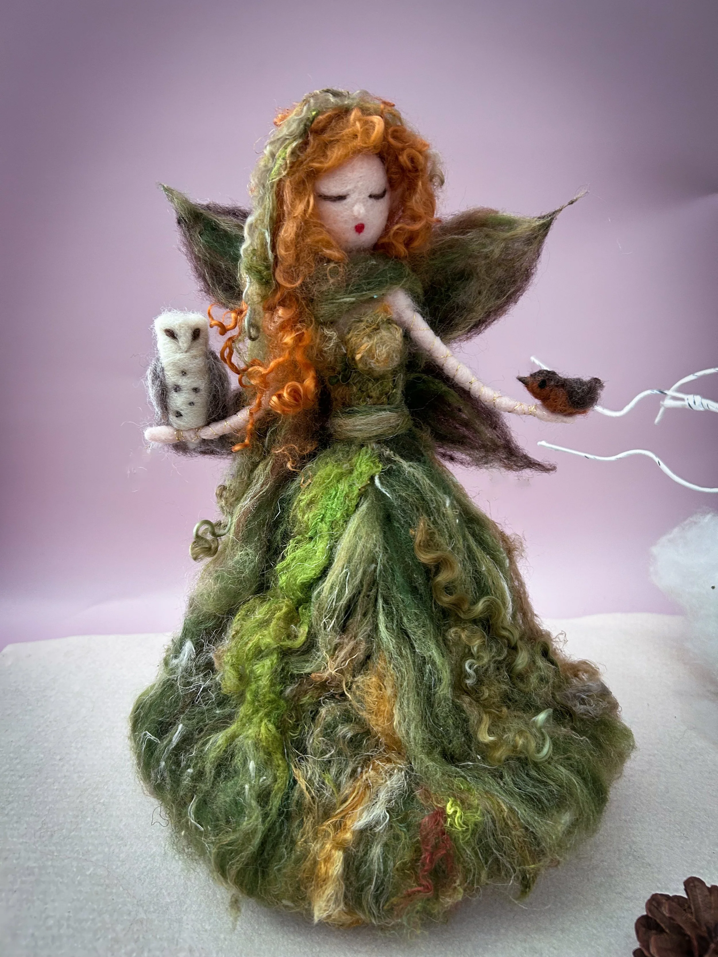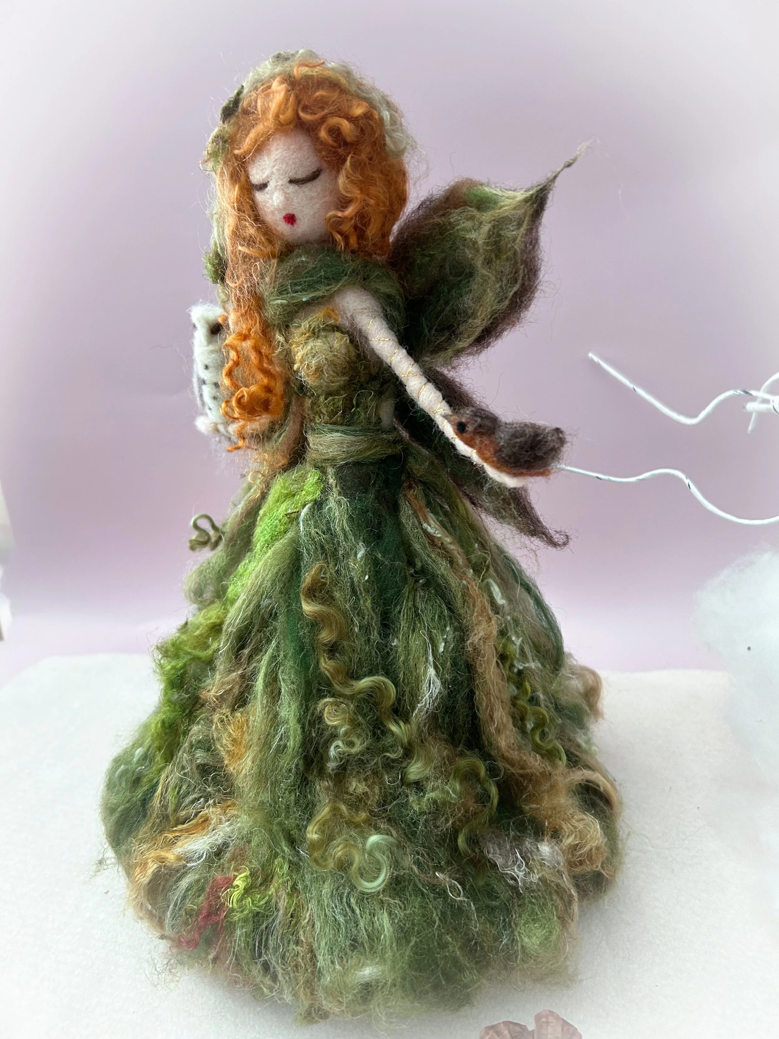 Needle felted from soft merino wool, silk, and natural fibers, this Winter Snow Queen Sorceress embodies the powerful stillness of the Solstice night. Cloaked in black and silver, her gown flows like winter’s midnight sky, with snowy white curls and antlered crown shimmering under soft light. A felted snowy owl rests on her arm, symbol of wisdom and clarity through the dark.