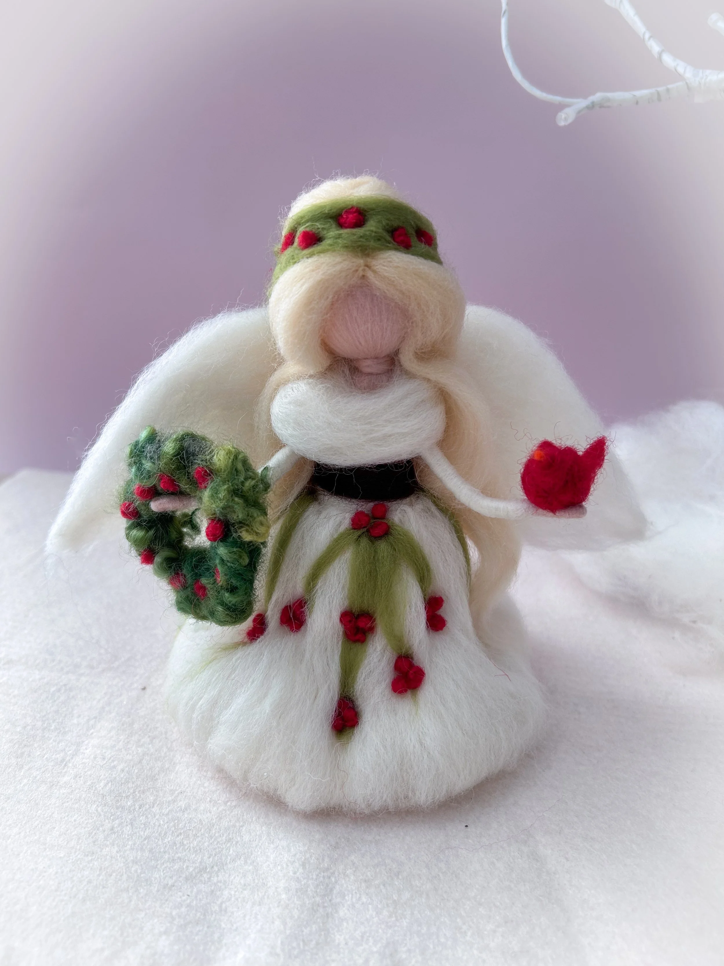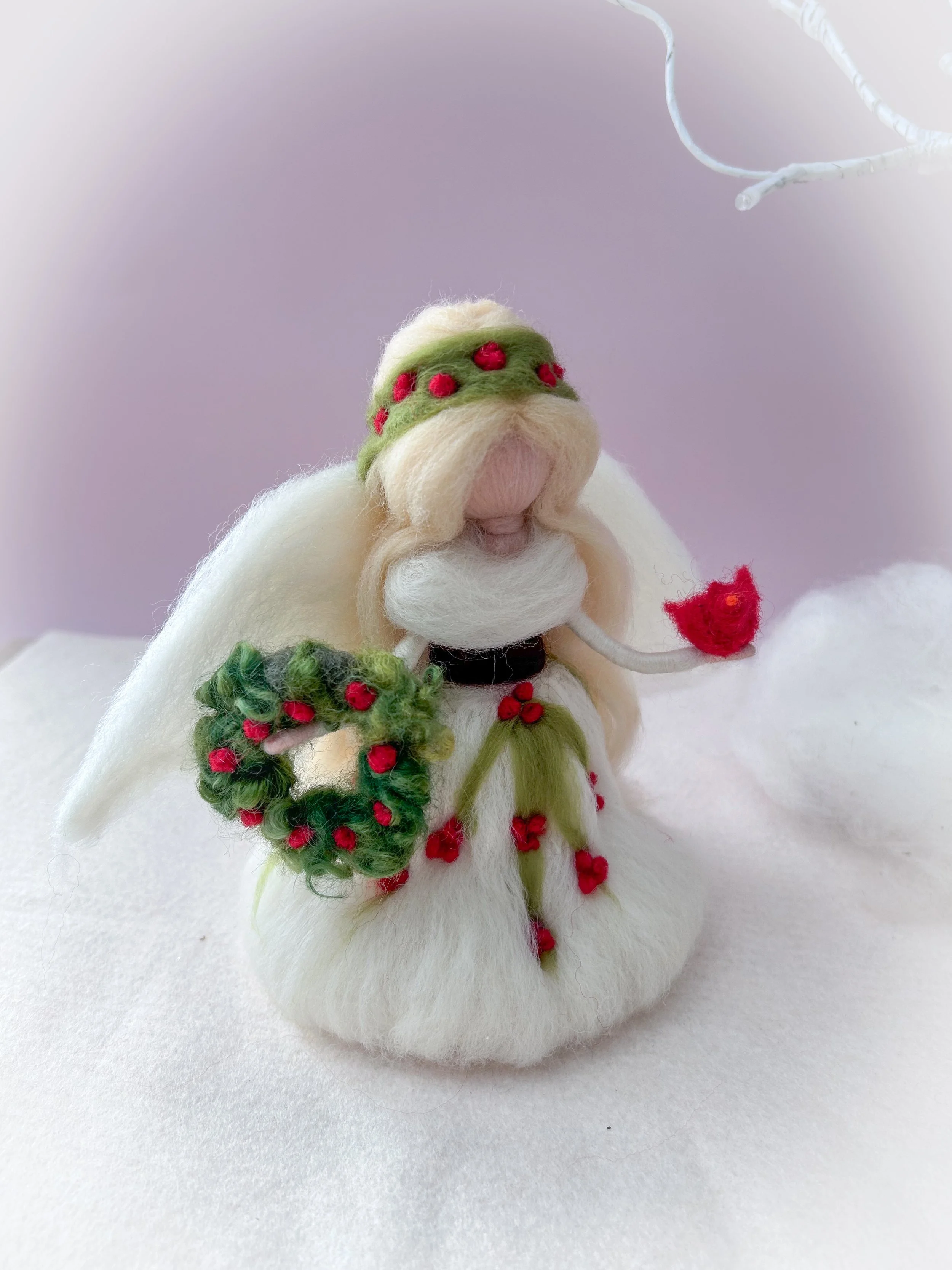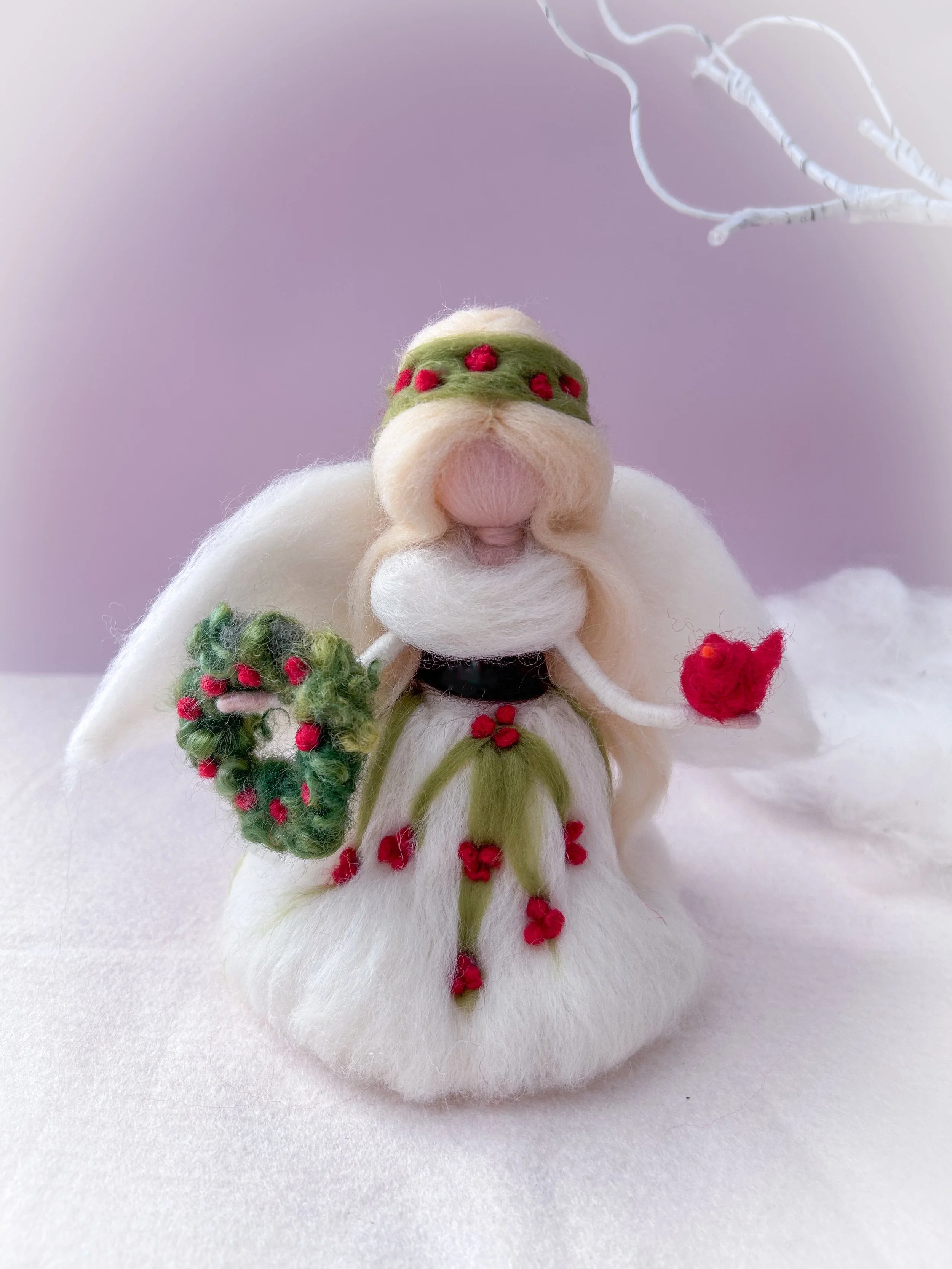 Needle felted from natural wool and silk, this Christmas Angel is the crowning touch for a tree that radiates quiet beauty and timeless grace. Her gown shimmers softly, blending the textures of fine merino and silk to create a gentle luster under winter light.