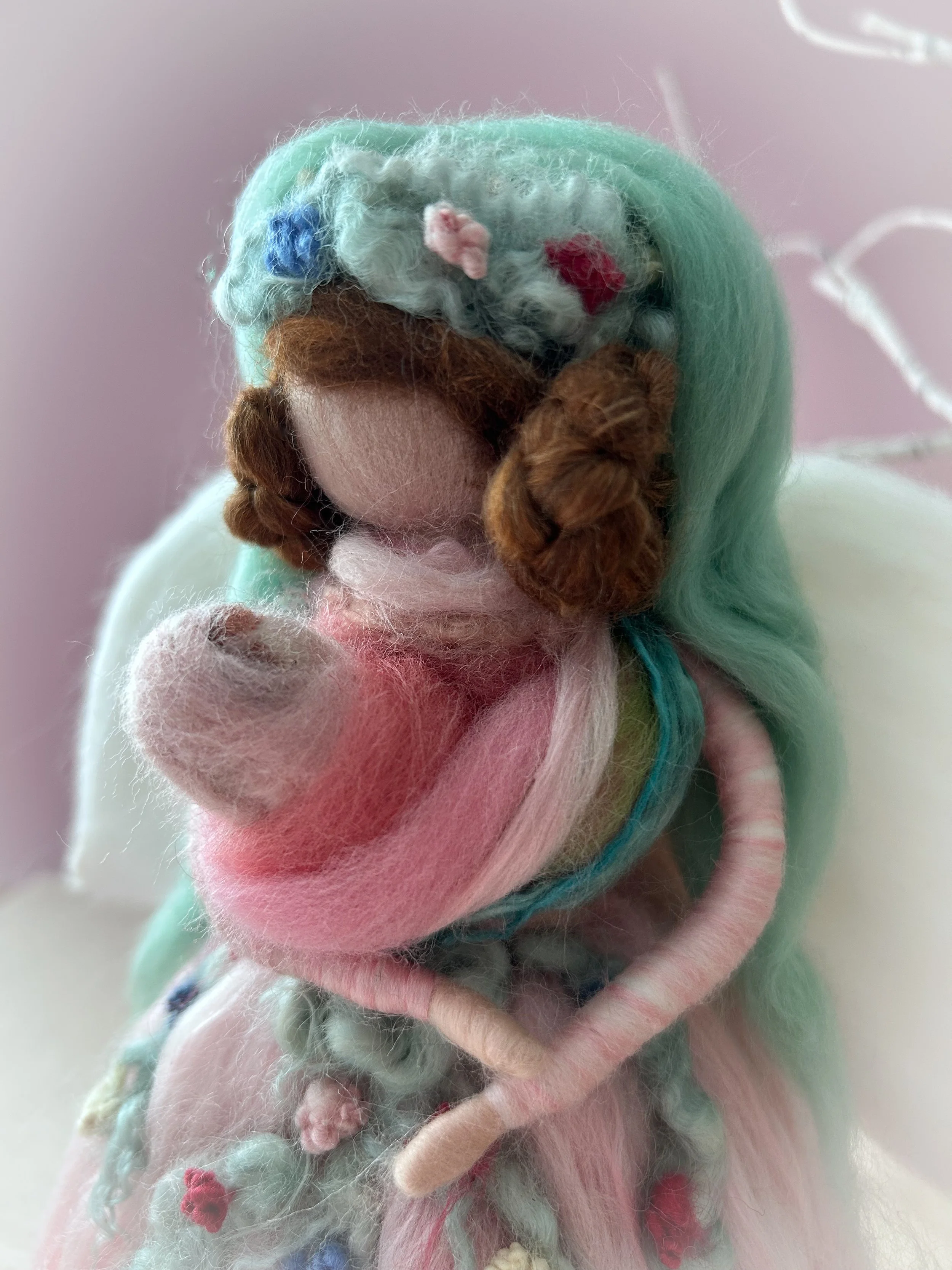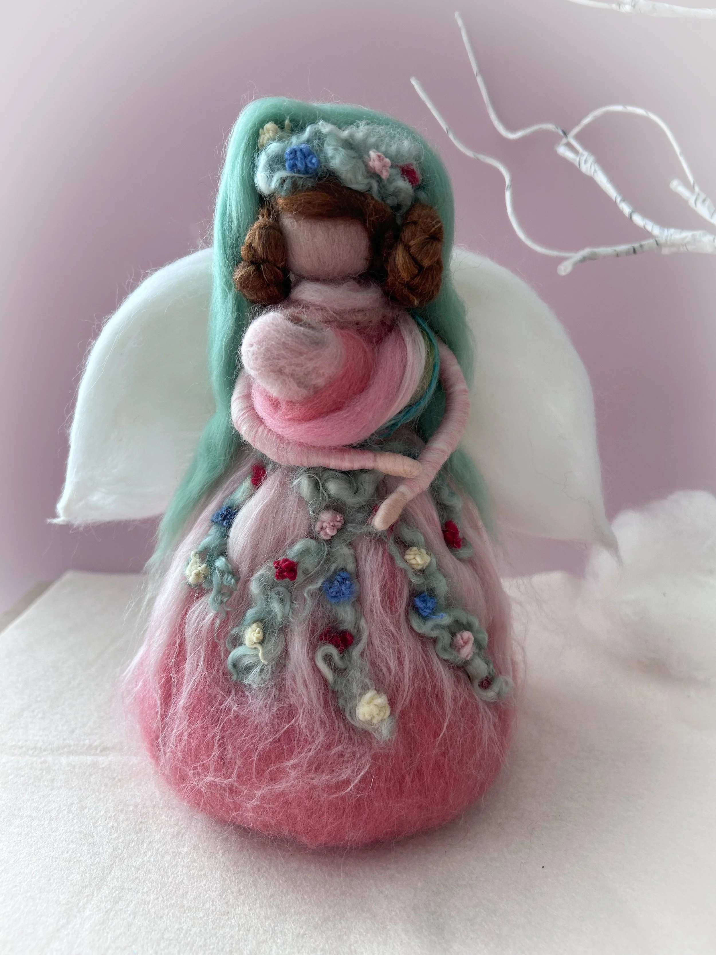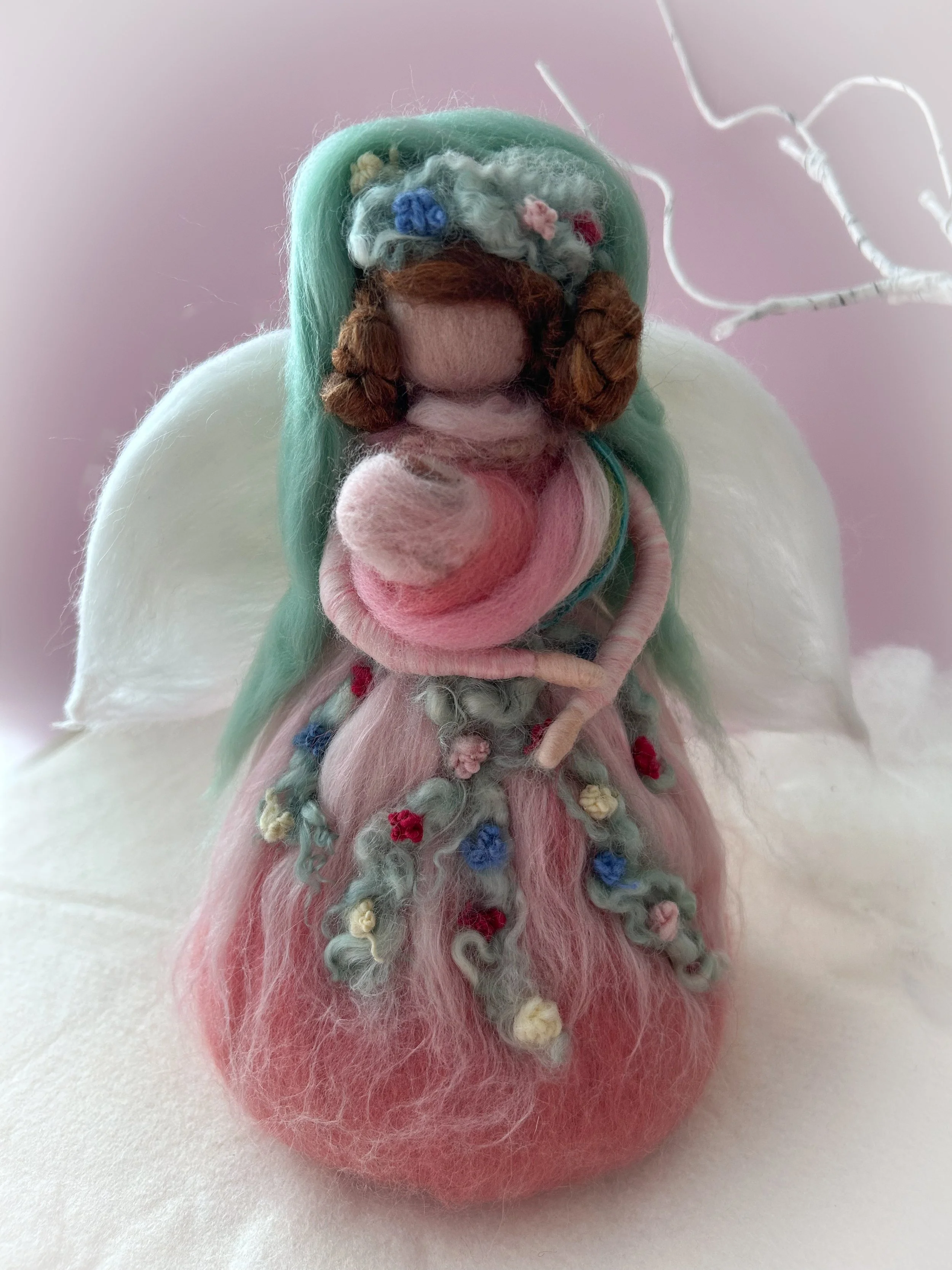 Needle felted from natural wool and silk, this Christmas Angel is the crowning touch for a tree that radiates quiet beauty and timeless grace. Her gown shimmers softly, blending the textures of fine merino and silk to create a gentle luster under winter light.